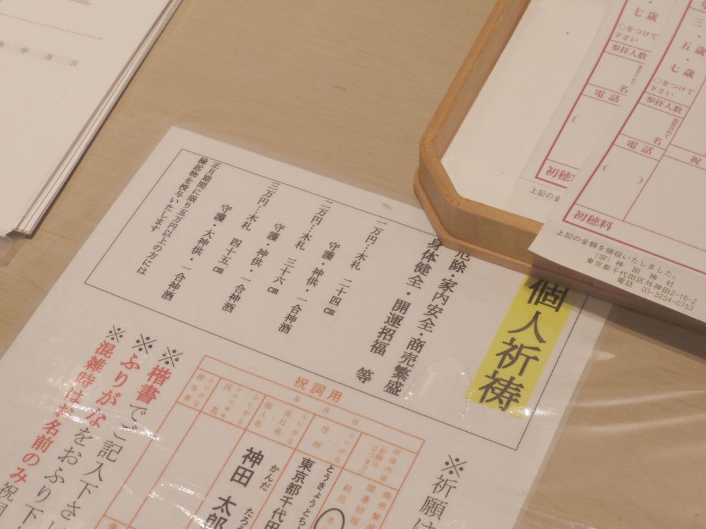 神田明神は、神田・日本橋・秋葉原など、日本の経済の中心となるエリアを含んだ町を氏子としており、個人だけではなく、多くの企業から参拝に訪れる方も多いそうです。今回はミッション的に厄祓い一択ですが、商売繁盛や縁結び、安産祈願などのなかから2つを選んで、ご祈祷してもらうこともできます。