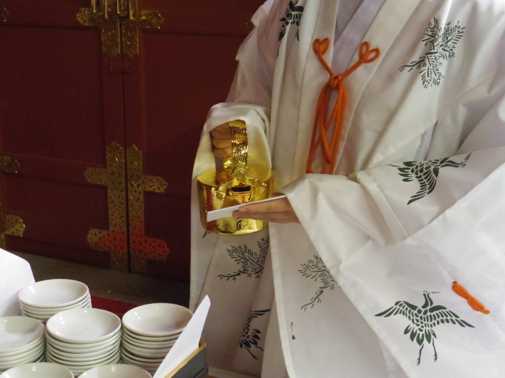 個人的に一番緊張したのは玉串拝礼でした。玉串とは、小さな白い花がつく榊の枝でつくられていて、神前にお供えするものです。お神酒やご神饌と同じような意味があるそうで、案内を受けながらご神前まで進み、この玉串を捧げます。