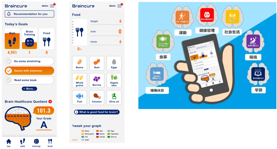 脳の健康改善アプリの利用において、「楽しく無理なく脳を健康にするための18の行動指針(BHQ Actions)」**を網羅した初のスマートフォンアプリである、『Braincure』を提供しています。BHQ Actionsに沿った日々のアクティビティー(健康管理、運動、社会生活、食事、睡眠休息、学習、環境)を入力することにより脳の健康状態を推定する推定BHQのスコアを算出することができます。さらに、BHQ Actionsに沿った脳を健康にするための情報を提供することにより、運動量の調整、食事改善、ストレス低減に向けたアクションを促し、アプリユーザーの脳の健康維持増進のサポートを実施しています。