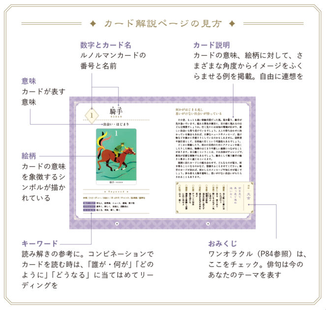 また、本書で採用した、おみくじ感覚で気軽に楽しめる「ワンオラクル」(1枚引き)は、ルノルマンカード初心者が気軽に楽しめるのはもちろん、今日の運勢、今の課題、テーマなど、短い期間のことを聞くのにも最適です。
