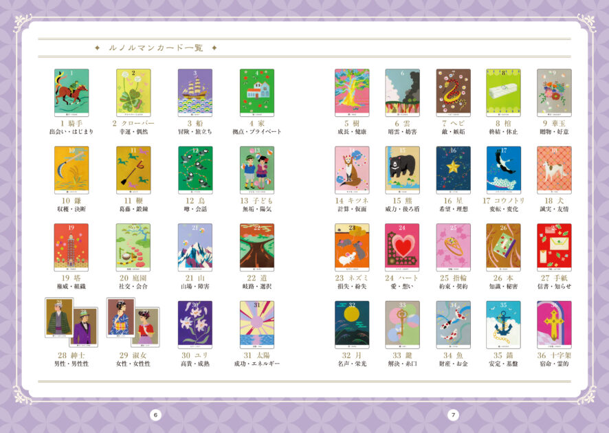 1 騎手/2 クローバー/3 船/4 家/5 樹/6 雲/7 ヘビ/8 棺/9 華玉/10 鎌/11 鞭/12 鳥/13 子ども/14 キツネ/15 熊/16 星/17 コウノトリ/18 犬/19 塔/20 庭園/21 山/22 道/23 ネズミ/24 ハート/25 指輪/26 本/27 手紙/28 紳士/29 淑女/30 ユリ/31 太陽/32 月/33 鍵/34 魚/35 錨/36 十字架