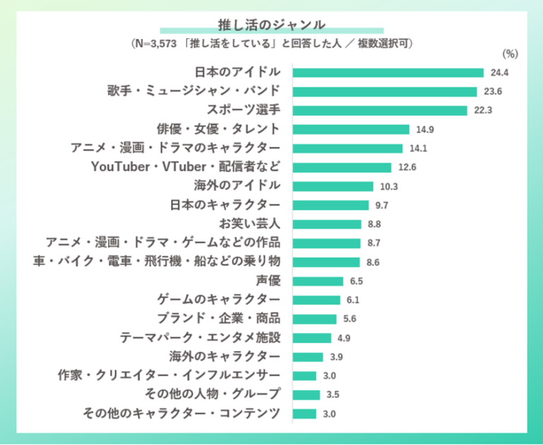 推しのジャンルは、「日本のアイドル」の回答が24.4%と最も多く、次いで、「歌手・ミュージシャン」が23.6%、「スポーツ選手」が22.3%だった。
