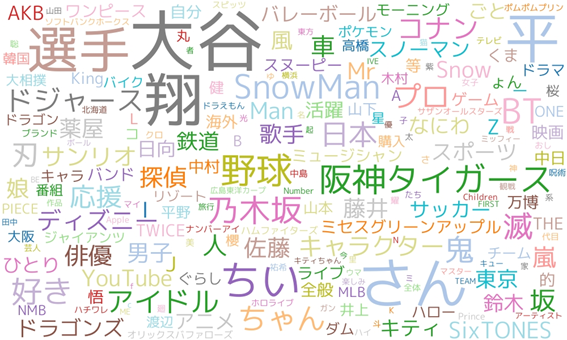 自由記述形式で推している人や物の名前を聴取したところ、「大谷翔平選手」をはじめとする野球選手やプロ野球、メジャーリーグの球団の他、「SnowMan」「SixTONES」といった日本のアイドルも多く見られた。