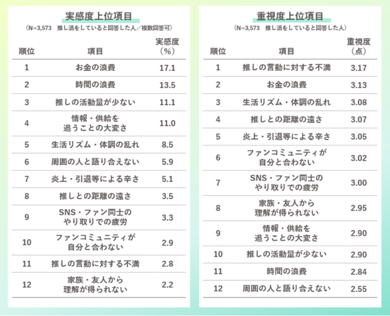 推し活で感じたネガティブな出来事は「お金の浪費」の回答が17.1%と最も多く、幸福度が下がる出来事として「推しの言動に対する不満」が最も重視されている。